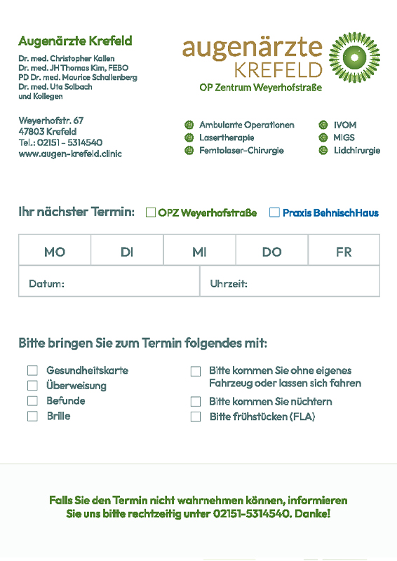 Für das OP-Zentrum der Augenärzte Krefeld wurde eine durchgängige visuelle Identität entwickelt, die Kompetenz, Vertrauen und Modernität ausstrahlt. Farbschema, Typografie und wiederkehrende Gestaltungselemente sorgen für Wiedererkennbarkeit – von der Website bis zu Broschüren und Visitenkarten.